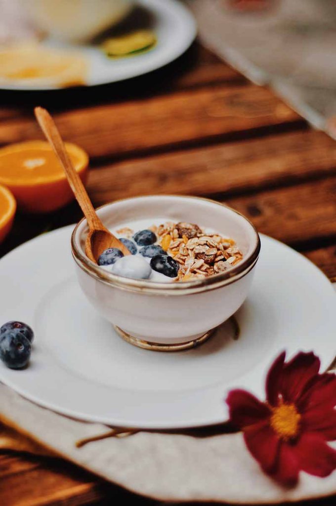 Granola, raspberry coulis